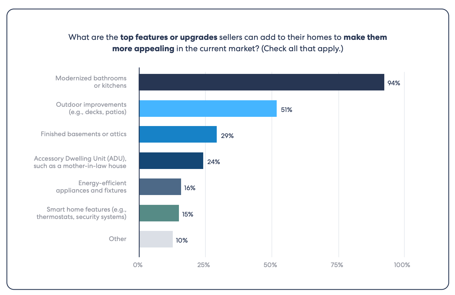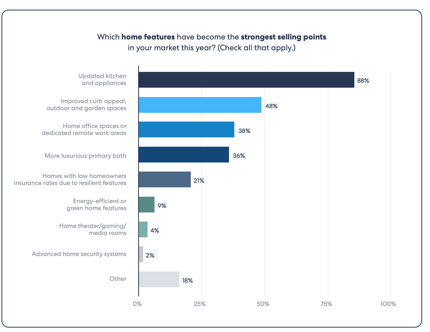 According to Homelight’s “Top Agent Insights End of Year 2024 Report”, “88% of agents say that upgraded kitchens and appliances are one of the best selling points for homes”--a significant increase from the previous year. https://homelightblog.wpengine.com/wp-content/uploads/2024/12/homelight-top-agent-insights-end-of-year-2024-report.pdf